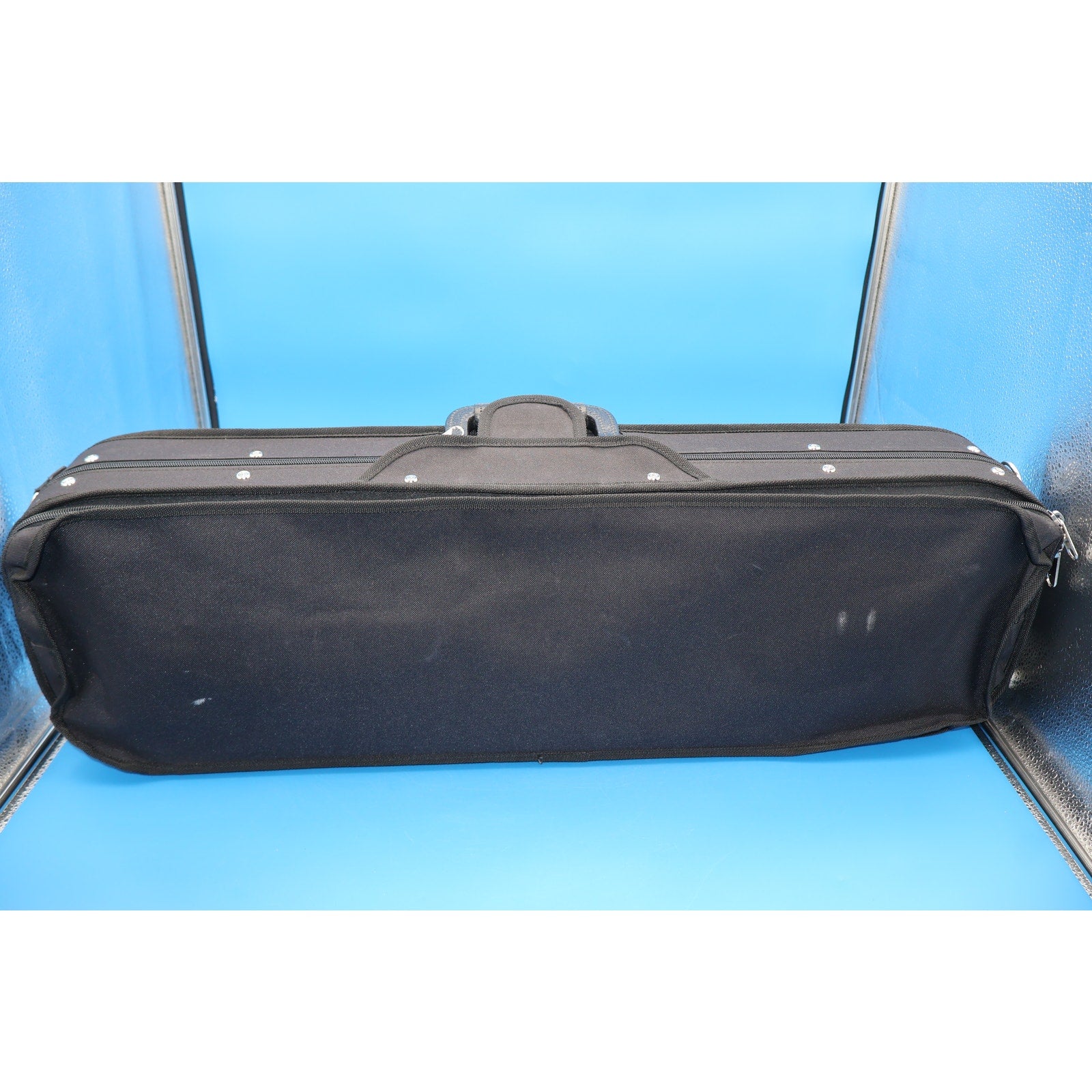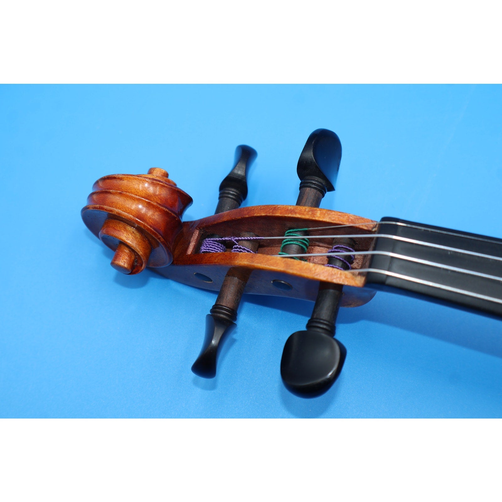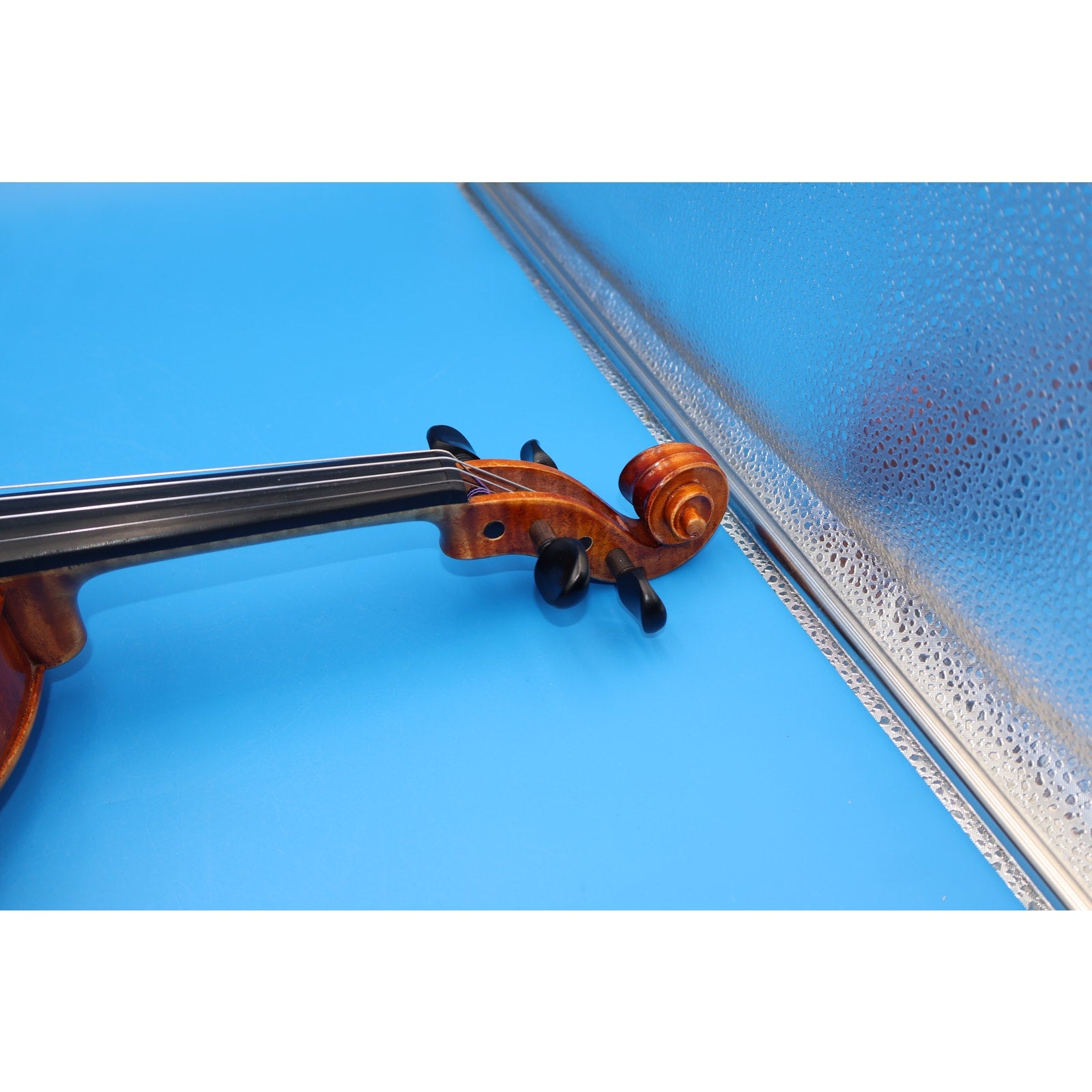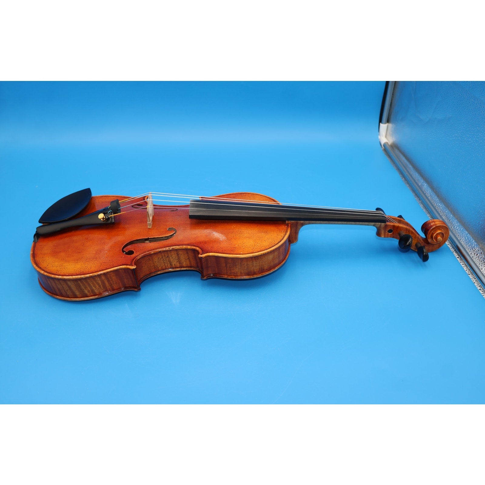 You are looking at a Charles W. Liu Stephano Laricci 4/4 Violin, Anno 2016. It is used but in good condition. It shows normal signs of use such as scuffs, scratches, and light grime around the violin, but nothing major or distracting—just average wear from everyday playing.