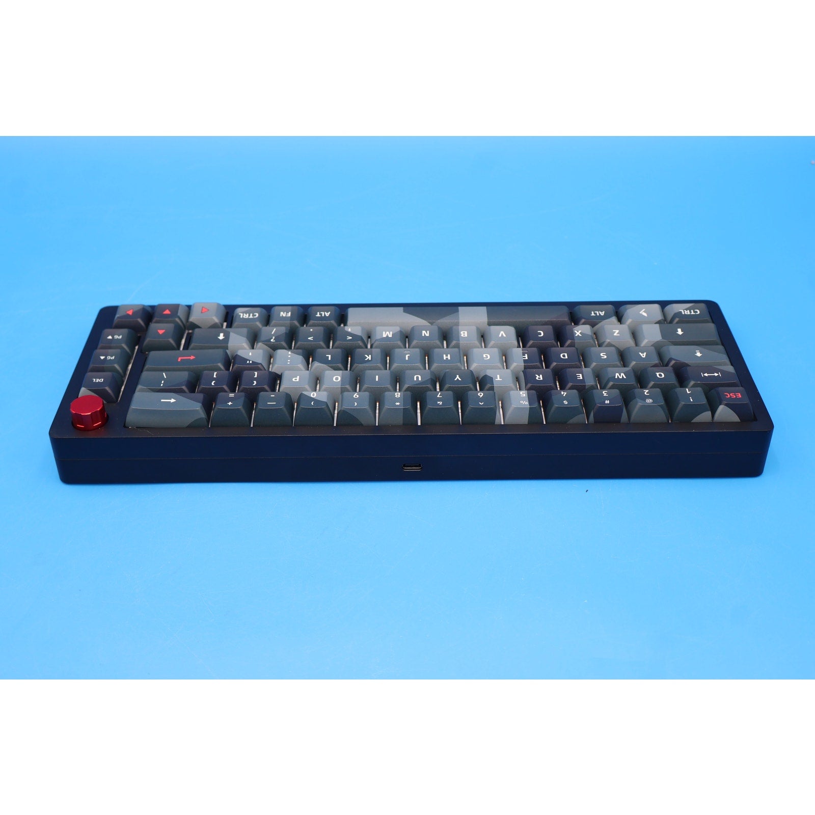 You are looking at a Das Keyboard DeltaForce 65 Cyber Kamo 65% mechanical keyboard. This unit is used but in good overall condition, showing typical signs of use such as light scuffs, scratches, and minor surface grime—nothing major or distracting.
